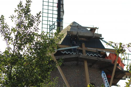 Im Oktober wurde die Haube der Mühle mit Eichenschindeln neu eingedeckt. Die Arbeiten waren nur möglich dank eines Zuschusses des LVR sowie einer großzügigen Spende der Vereinsmitglieder. Die Arbeiten wurden durchgeführt durch den Mühlenbauer van Bijk aus Afferden (NL).